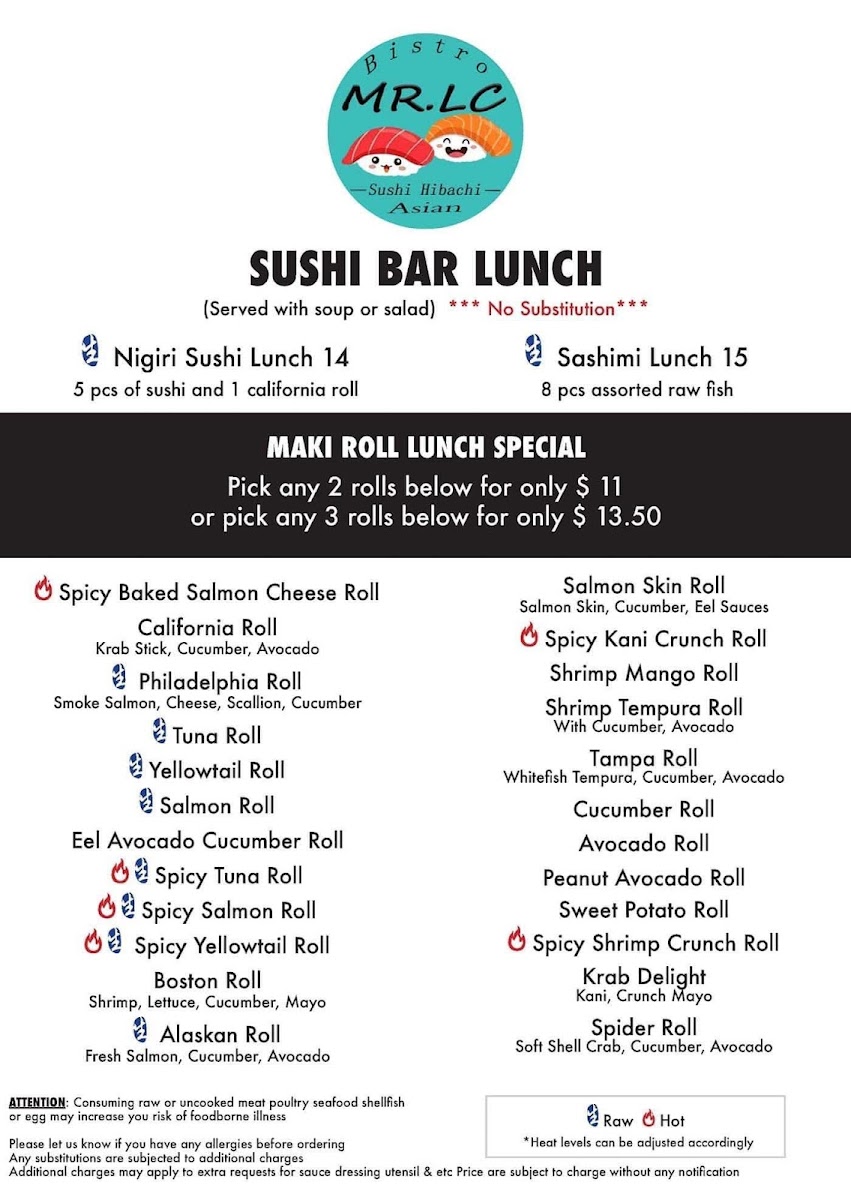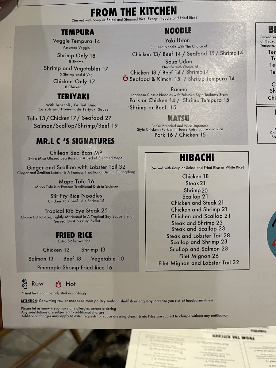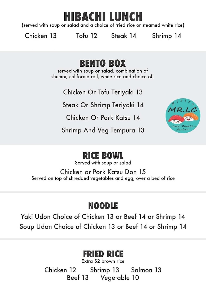 From a reviewer’s perspective, the menu at Mr Lc Sushi Hibachi Asian Bistro feels like a thoughtful summary of what makes a modern Asian bistro appealing, balancing creativity, comfort, and variety in a way that suits many tastes. The sushi selection alone is extensive, starting with crowd-pleasing options from the sushi bar like the December Roll and Christmas Roll, then moving into approachable lunch choices such as Nigiri Sushi Lunch, Spicy Baked Salmon Cheese Roll, California Roll, Philadelphia Roll, and Tuna Roll, which are perfect for guests seeking familiar flavors done well. For something heartier, the rice bowls like Chicken Or Pork Katsu Don provide a satisfying, savory option, while classic rolls including Lobster Salad Roll, Pepper Tuna Avocado Roll, Spider Roll, Spicy Salmon Roll, and Spicy Tuna Roll showcase a strong foundation in traditional sushi craftsmanship. Vegetarian diners are not overlooked, with simple yet refreshing vegetable rolls such as Avocado Roll, Cucumber Roll, Asparagus Roll, Avocade Cucumber Roll, and Sweet Potato Roll. The tempura section, featuring Veggie Tempura, Shrimp Only, Shrimp And Vegetables, and Chicken Only, adds a crispy contrast, while signature dishes like Chilean Sea Bass, Mapo Tofu, Ginger And Scallion With Lobster Tail, Stir Fry Rice Noodles, and Tropical Rib Eye Steak highlight the kitchen’s ambition beyond sushi. Fried rice lovers can enjoy classics like Chicken and Pineapple Shrimp Fried Rice, and hibachi fans will appreciate choices such as Chicken, Steak, Shrimp Scallop, and Chicken And Steak. The Sushi & Sashimi offerings-Tuna, Salmon, Smoked Salmon, Salmon Roe, and Escolar-along with entrees like Sushi Platter, Sashimi Platter, Sushi & Sashimi Combo, Unagi Don, and Chirashi, reinforce the restaurant’s depth. Finally, chef-driven creations like the 1539 Roll, Mr.l C Roll, Sunset Point Roll, Dancing Dragon Roll, and Sweet Heart Roll, plus comforting favorites such as Beef Negi Maki, Chicken, Steak Or Shrimp Teriyaki, Chicken Or Pork Katsu, and Shrimp And Veg Tempura, neatly tie the menu together, leaving the impression of a well-rounded dining experience that confidently caters to both sushi purists and casual diners alike.